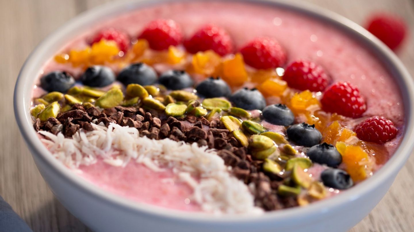 Kokosraspeln in Form des Buchstabens „C“ entlang des einen Rands der Müslischale streuen. Kakaonibs in einem Bogen neben den Kokosraspeln verteilen. Pistazien entlang der Kakaonibs streuen. Einen Bogen aus Blaubeeren neben den Pistazien verteilen. Mit den gehackten Aprikosen direkt neben dem Blaubeerbogen abschließen.